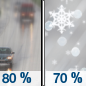 Friday Night - A slight chance of rain before 8pm, then a chance of rain and snow. Mostly cloudy, with a low around 33. South southwest wind around 5 mph. Chance of precipitation is 40%.