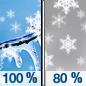Overnight - Rain before 5am, then rain, snow, and freezing rain. Steady temperature around 34. North northwest wind 10 to 15 mph. Chance of precipitation is 90%. Little or no ice accumulation expected. Total nighttime snow accumulation of less than a half inch possible.
